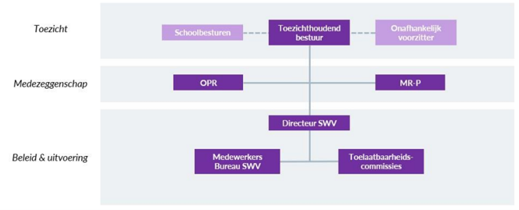 Het toezichthoudend bestuur bestaat uit vertegenwoordigers van de aangesloten zeven schoolbesturen, aangevuld met een onafhankelijk voorzitter (zonder stemrecht) die extern is geworven en benoemd. Het bestuur ziet toe op de uitvoering van de taken en de uitoefening van de bevoegdheden die door het bestuur aan de directeur zijn gemandateerd en staat de directeur met raad terzijde. Het bestuur fungeert als interne toezichthouder op de directeur op basis van een toeziend bestuursconcept, uitgewerkt in een toezichtskader. Het bestuur fungeert als werkgever van de directeur. Het bestuur keurt het ondersteuningsplan, de begroting en het jaarverslag goed en stelt de accountant aan. Het bestuur heeft interne commissies ingesteld die de toezichthoudende rol nader invulling geven met een kwaliteitscommissie, een financiële commissie en een werkgeverscommissie. Deze commissies adviseren het toezichthoudend bestuur over te nemen (strategische) bestuursbesluiten en fungeren als klankbord voor de directie van het samenwerkingsverband.